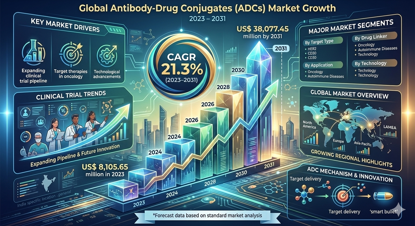 The Antibody Drug Conjugates (ADC) market is projected to grow significantly, reaching US$38,077.45 million by 2031 from US$8,105.65 million in 2023, registering a strong CAGR of 21.3% during 2023–2031. Rising demand for targeted cancer therapies and rapid advancements in biotechnology are driving the adoption of ADC treatments across global healthcare systems.