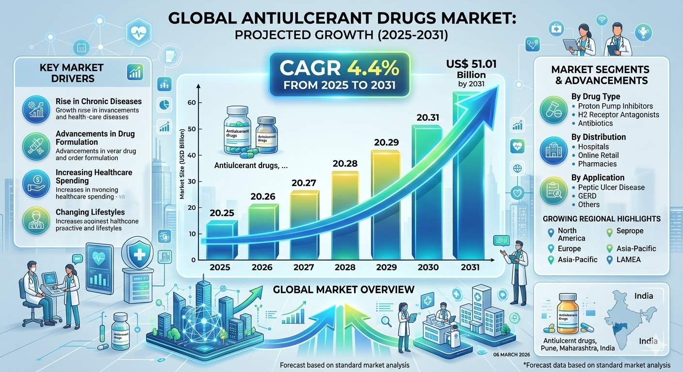 The Antiulcerant Drugs Market is projected to reach US$ 51.01 billion by 2031, growing at a CAGR of 4.4% during 2025–2031. The rising prevalence of gastrointestinal disorders such as peptic ulcers, stomach ulcers, and esophageal ulcers is significantly contributing to the growth of the market. Increasing healthcare awareness and improved diagnostic capabilities are also supporting the demand for effective ulcer treatment medications across the globe.